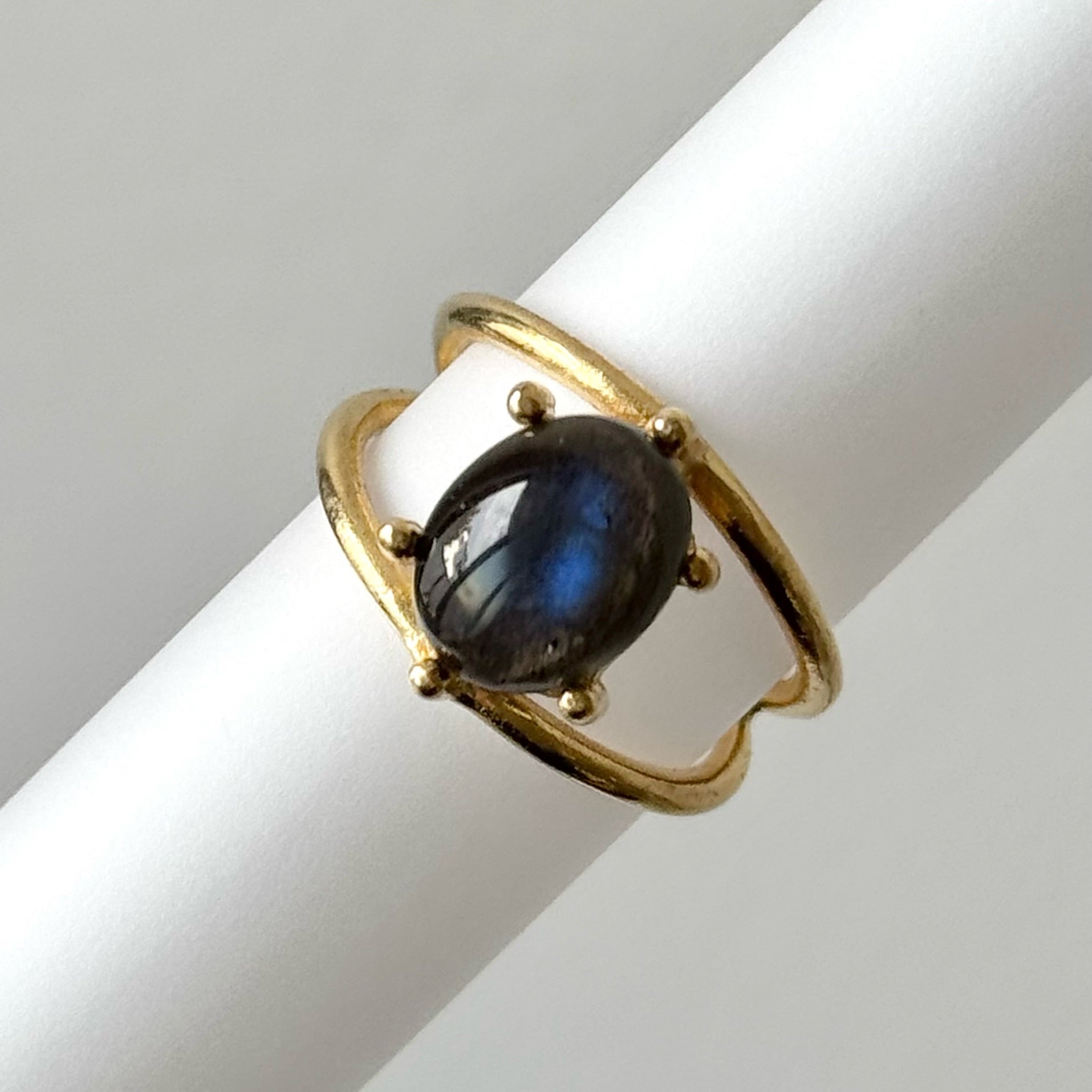 2本のリングでストーンを支えているような形のフリーサイズリング。 6つの爪で石を留めたどこかヴィンテージ感のあるデザインです。