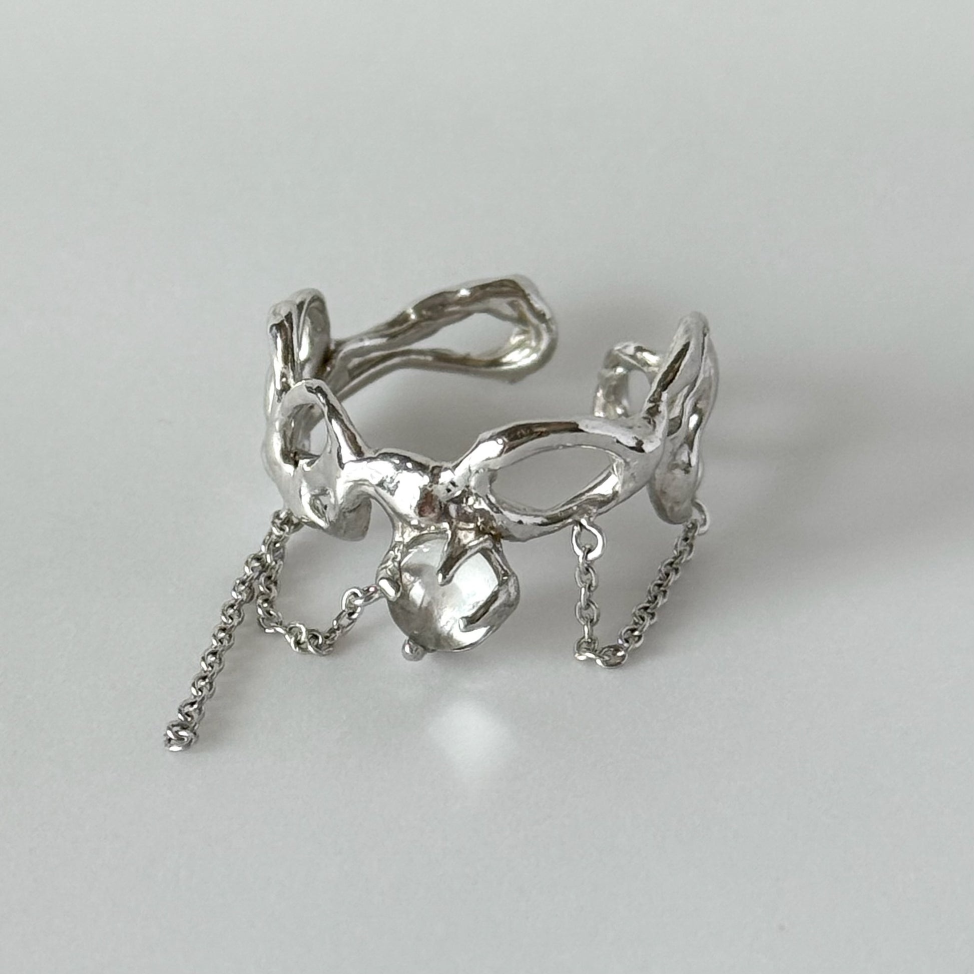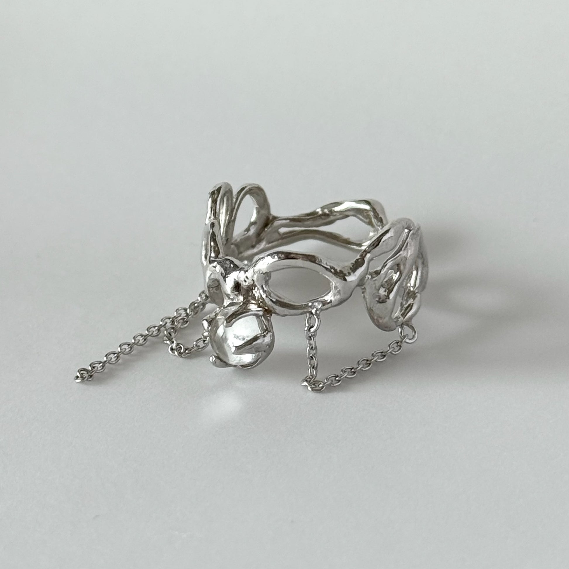揺れるチェーンが印象的な、抜け感のあるクリスタルのストーンリング。