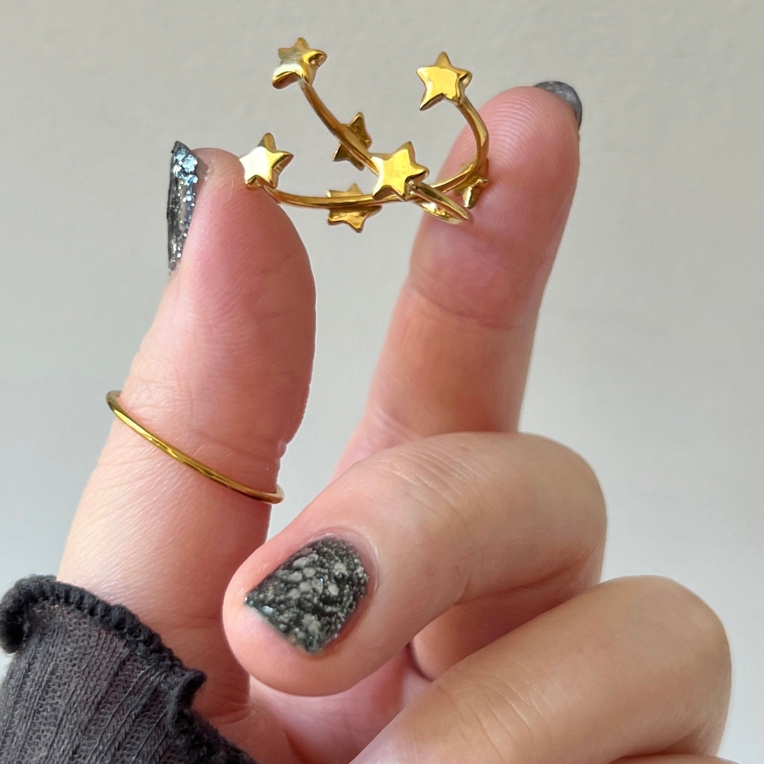 星を指の隙間から覗かせる着け方と、軌道をイメージしたクロスを見せる着け方との2way仕様です。