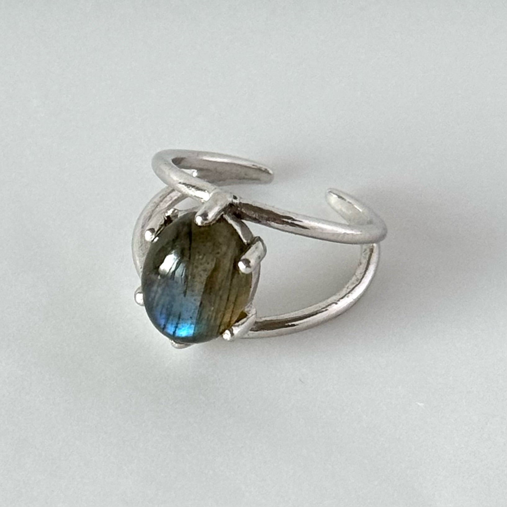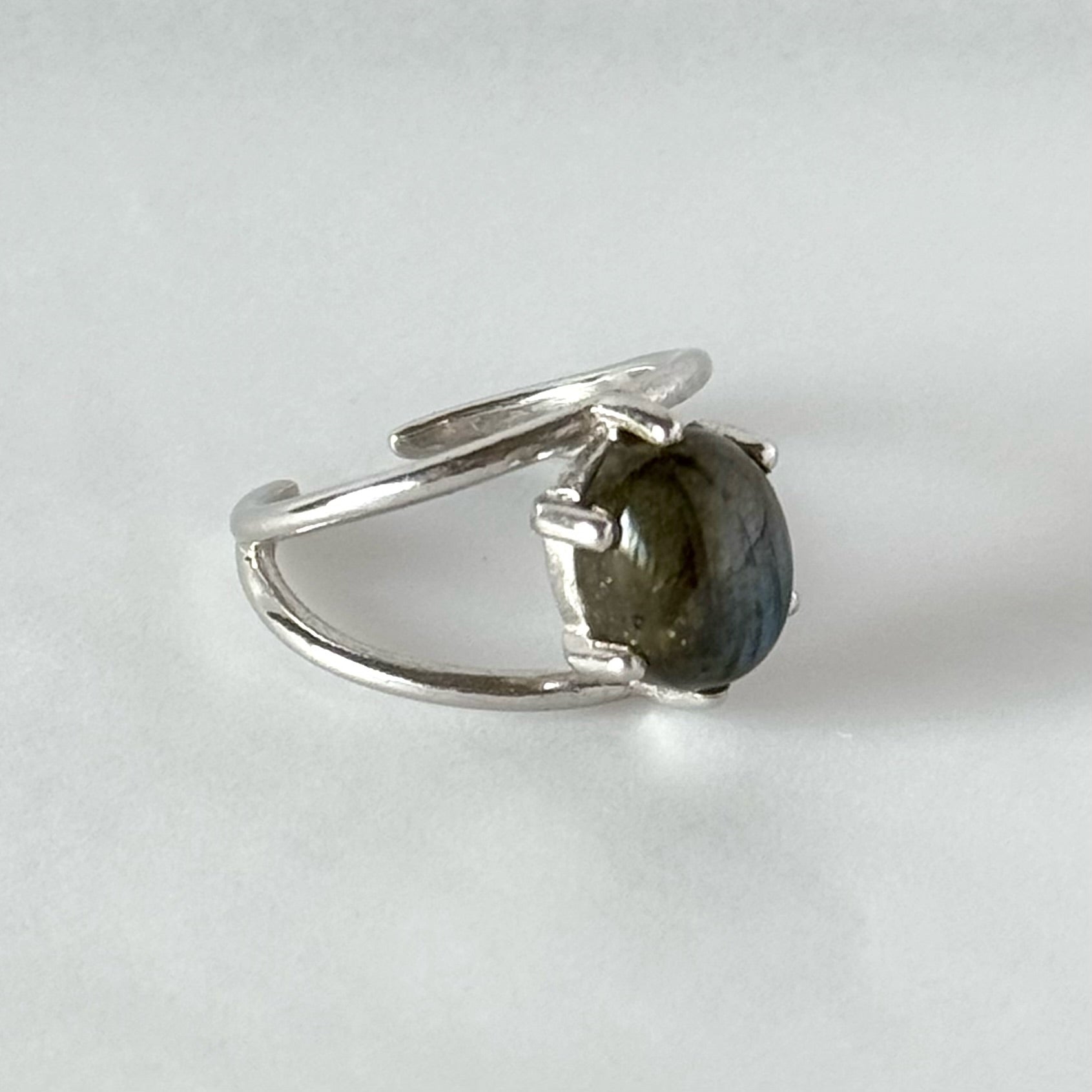 2本のリングでストーンを支えているような形のフリーサイズリング。 6つの爪で石を留めたどこかヴィンテージ感のあるデザインです。