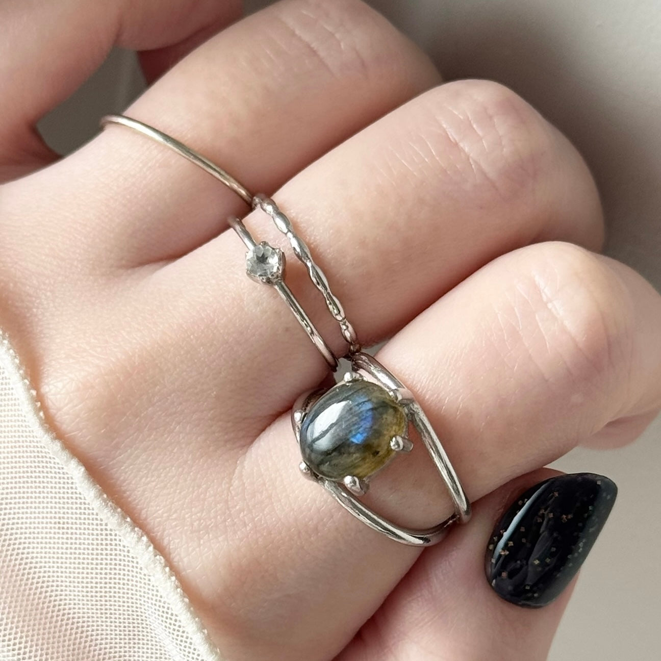material : rhodium plated brass / labradorite