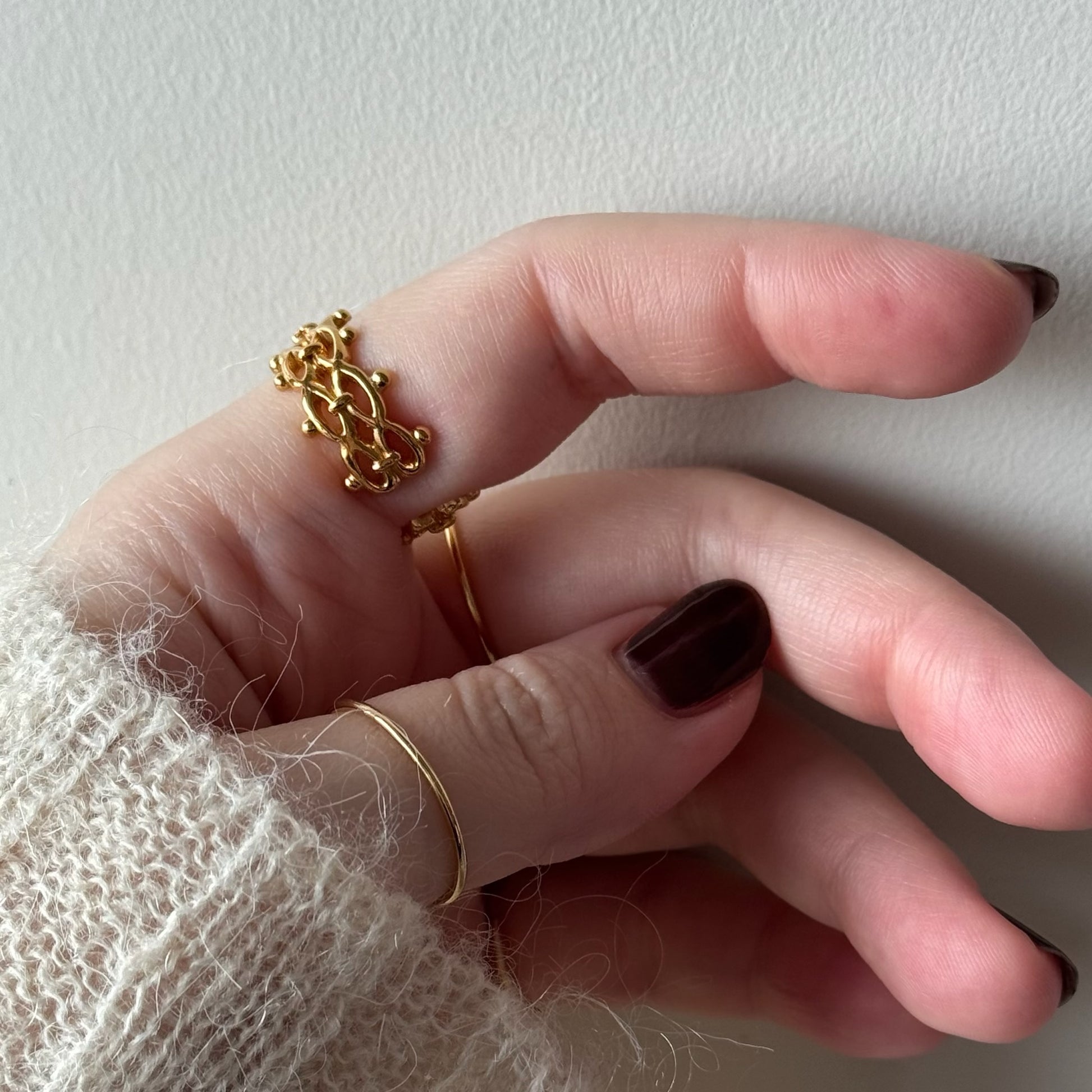 透かし感のあるデザインが重たくなりすぎず日常的に着けやすいデザインです。