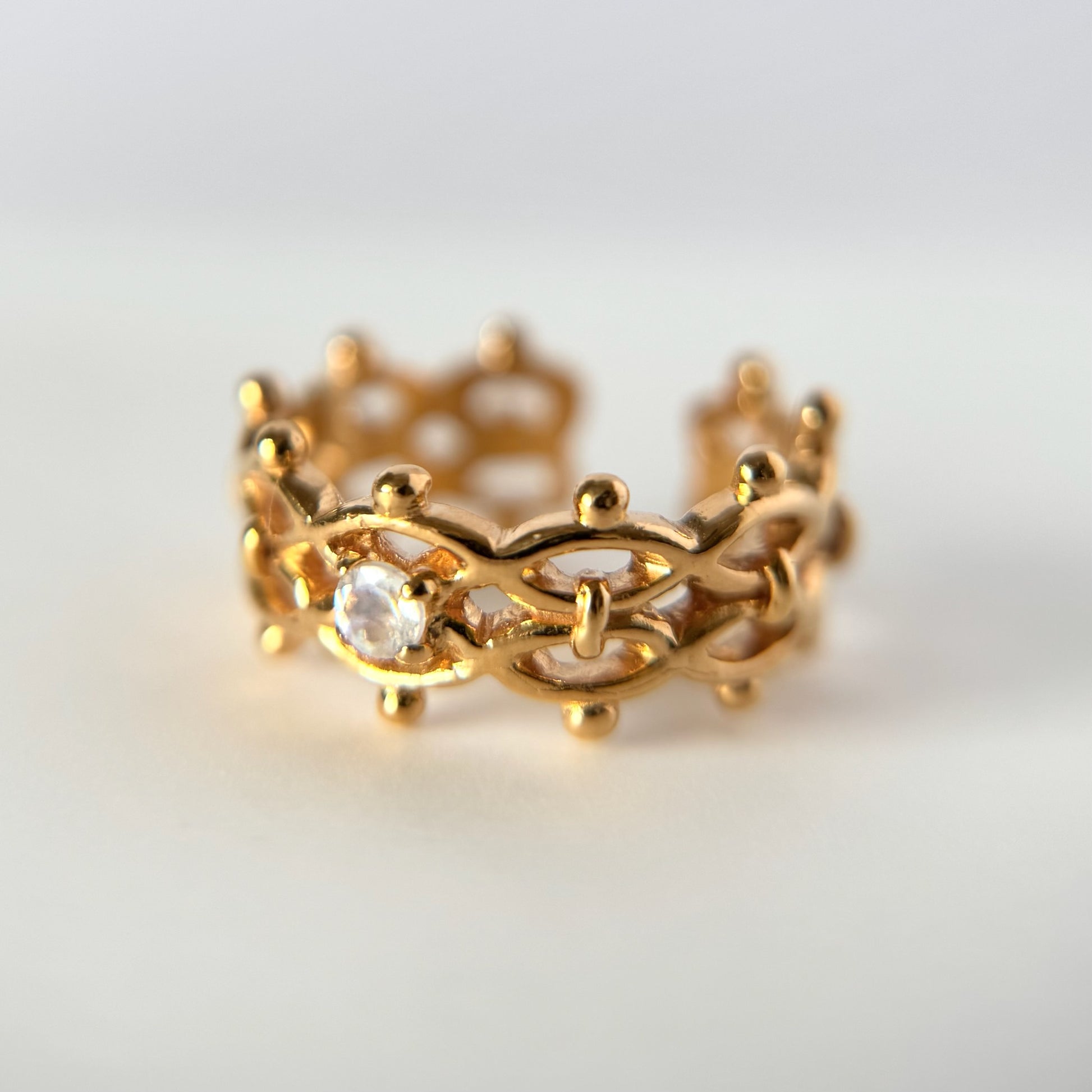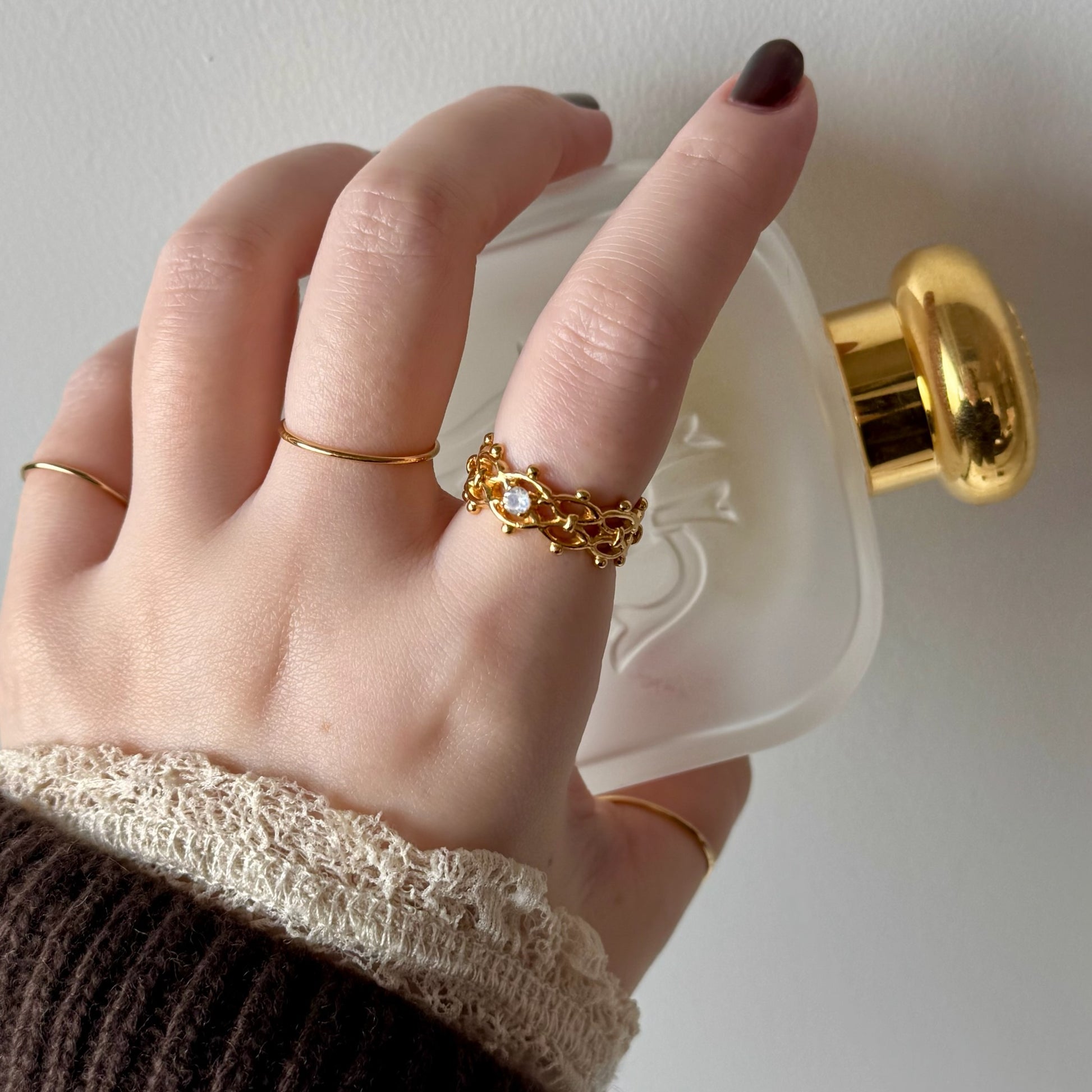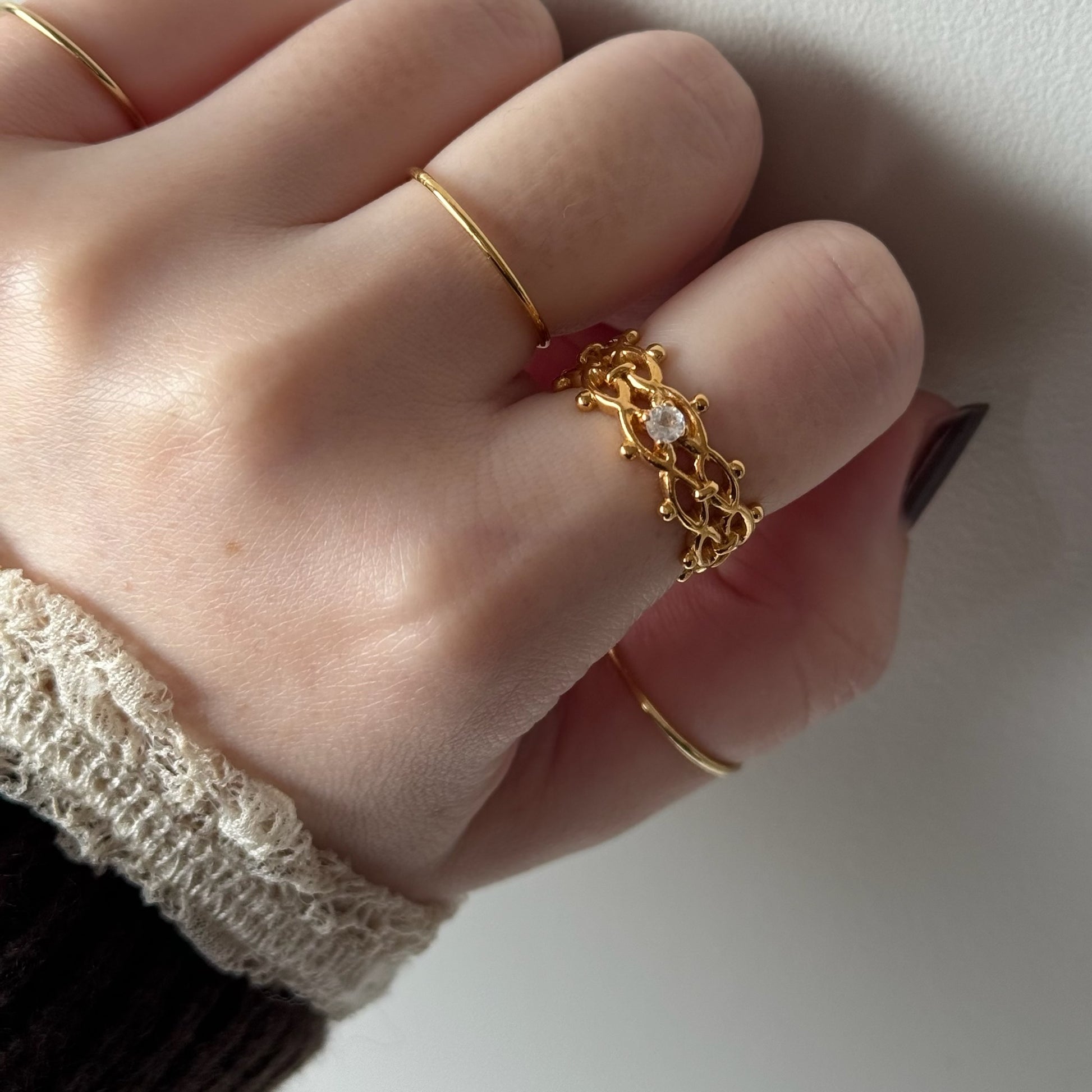 レースを編み上げたようなリングに小さなストーンを一粒つけました。