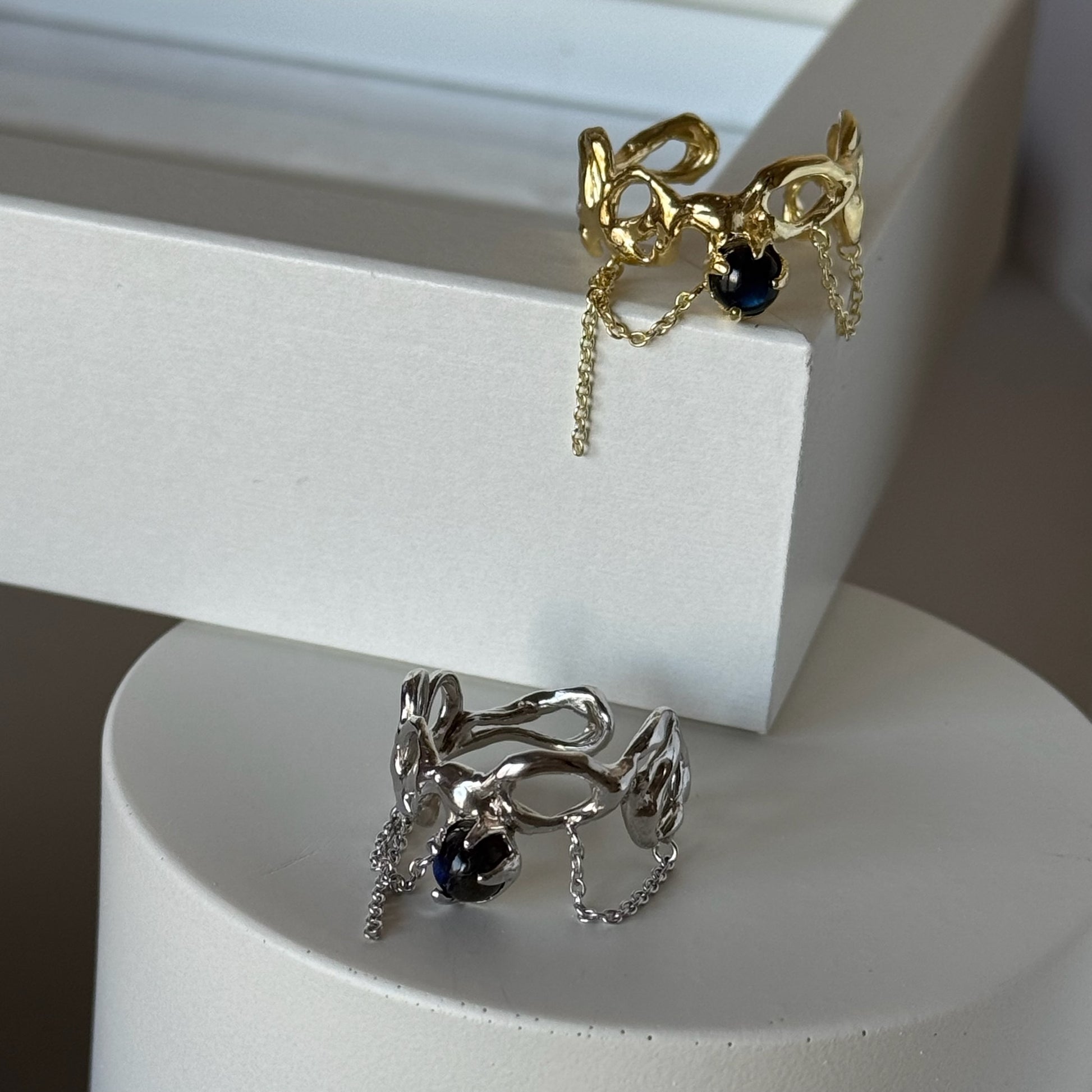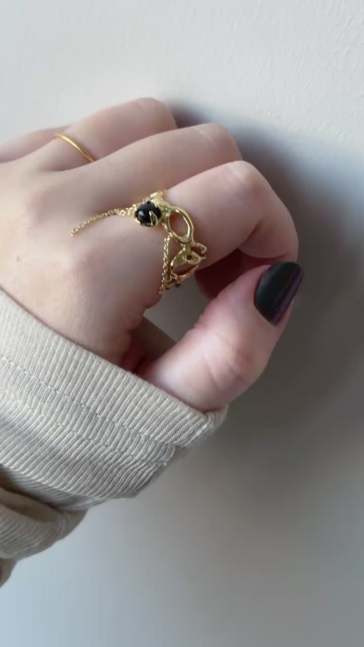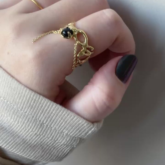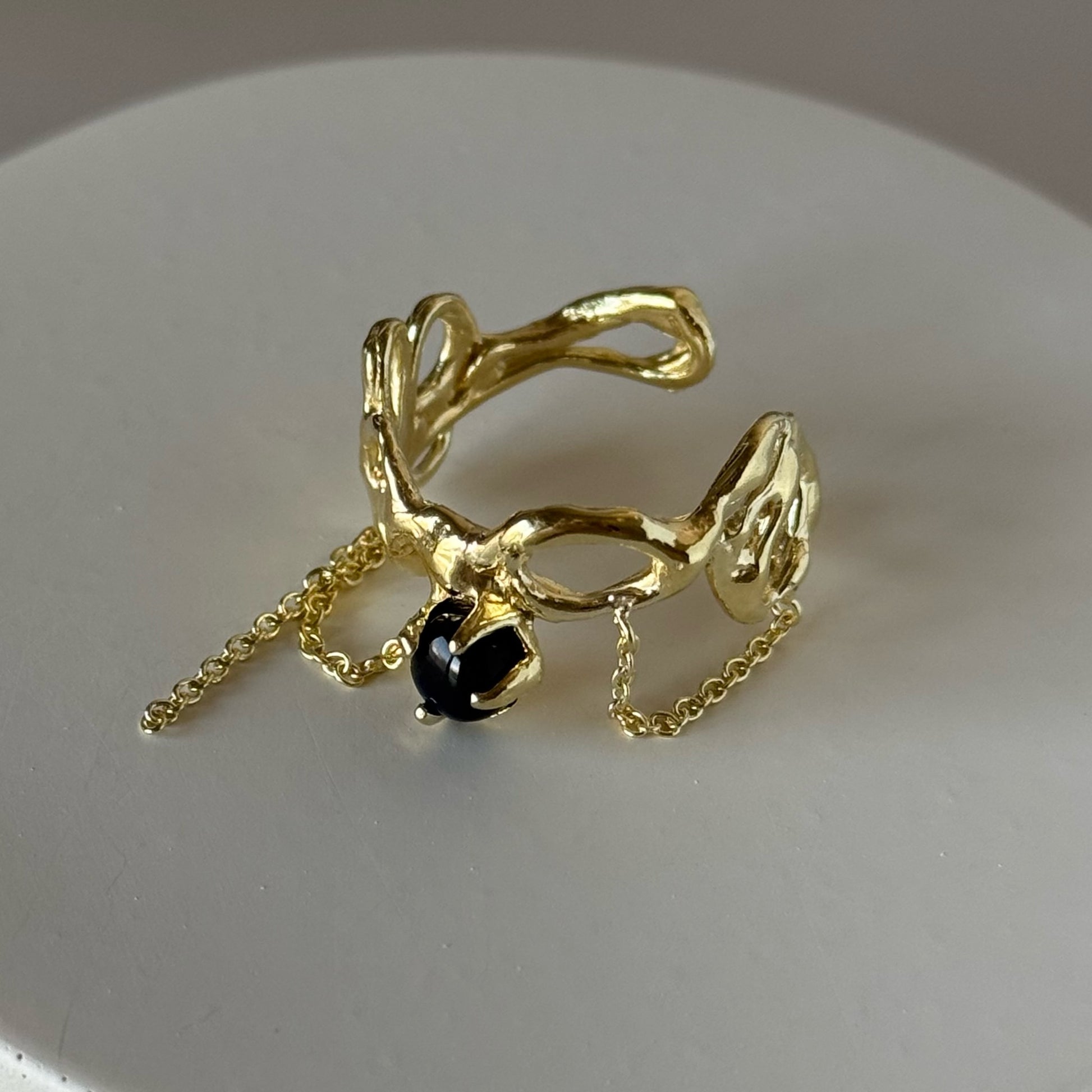 揺れるチェーンが印象的な、抜け感のあるクリスタルのストーンリング。