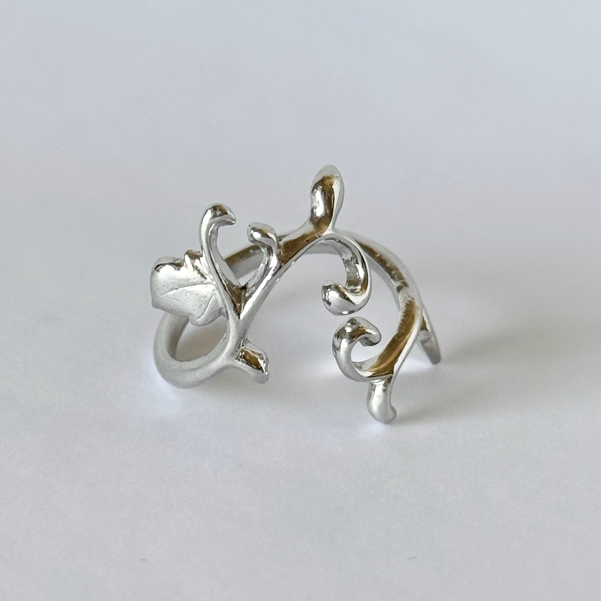 小さな葉が手元を飾る蔦のようなデザインリング。フリーサイズなので3-17号程度まで、お好きな指に着用いただけます。