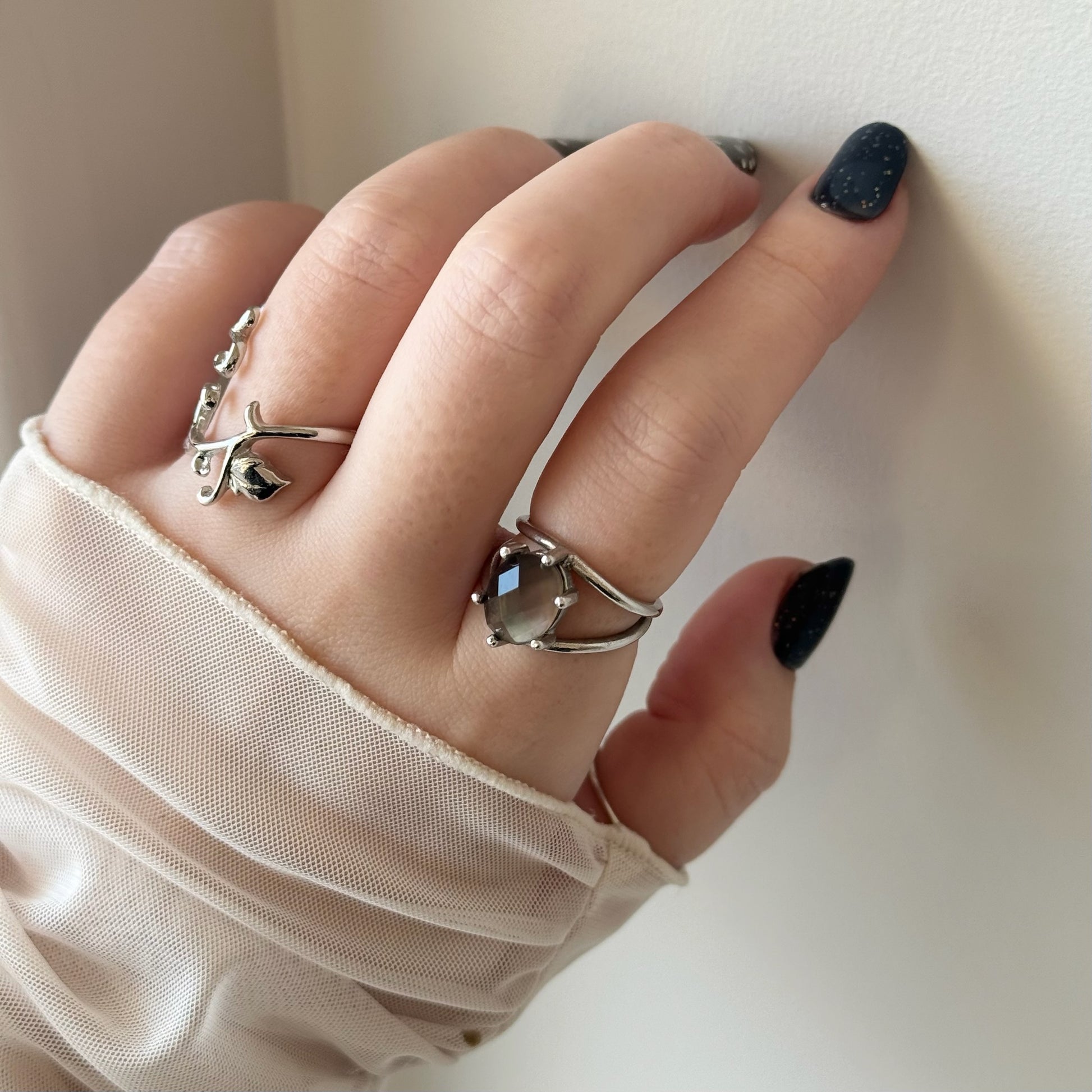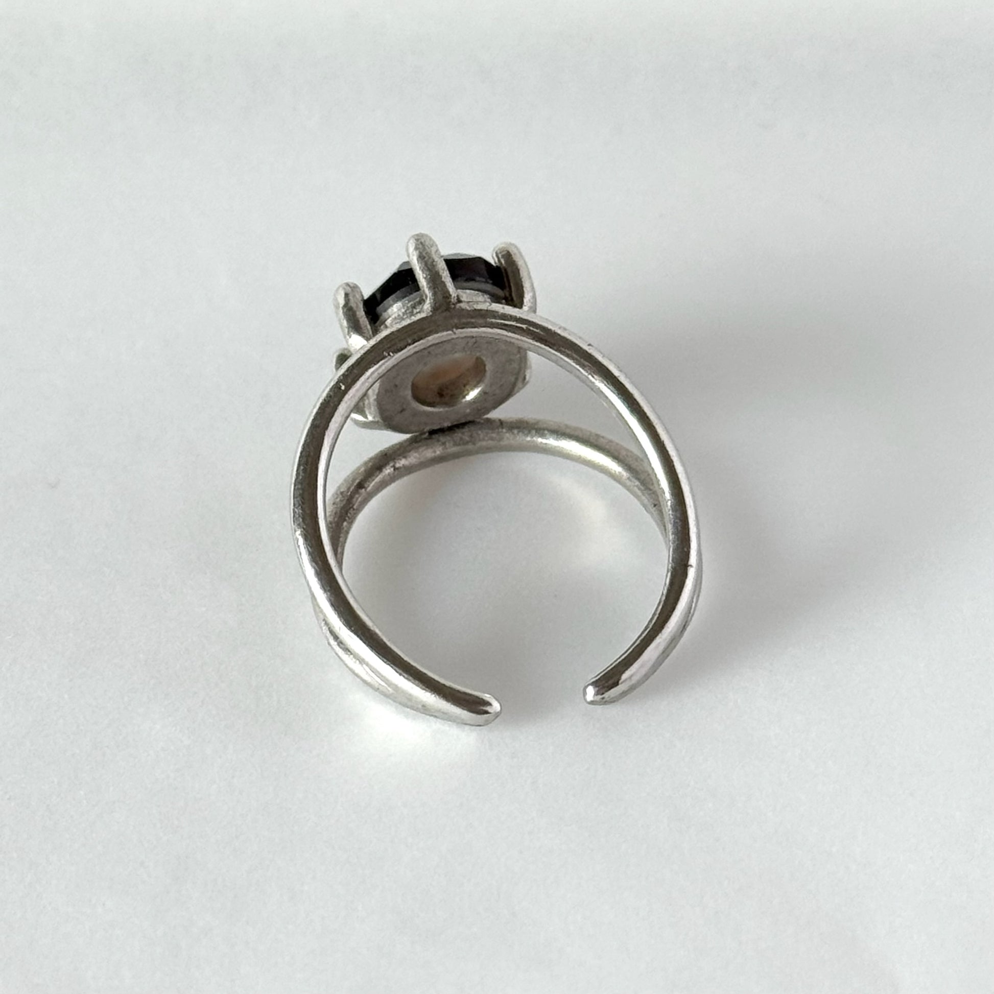 2本のリングでストーンを支えているような形のフリーサイズリング。 6つの爪で石を留めたどこかヴィンテージ感のあるデザインです。