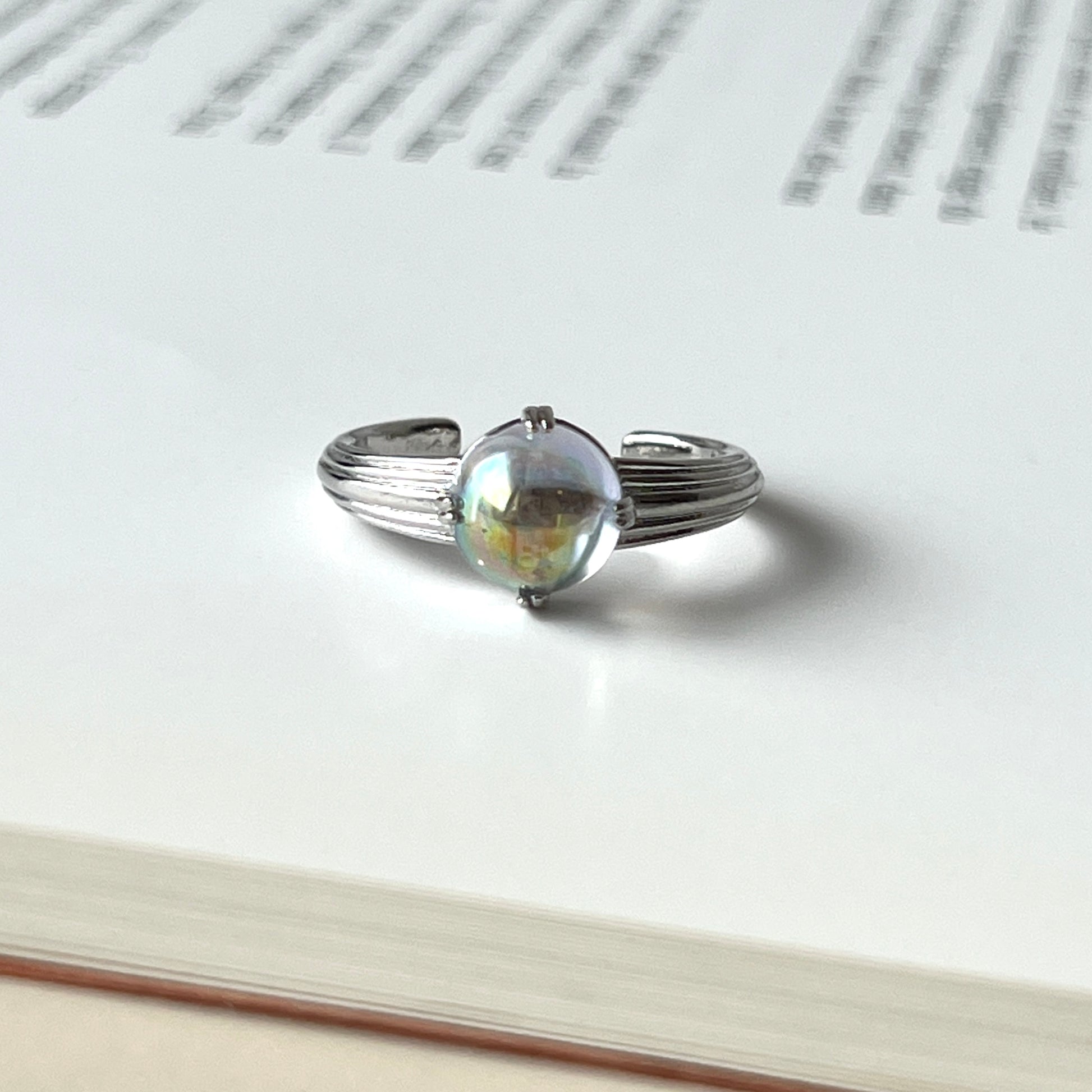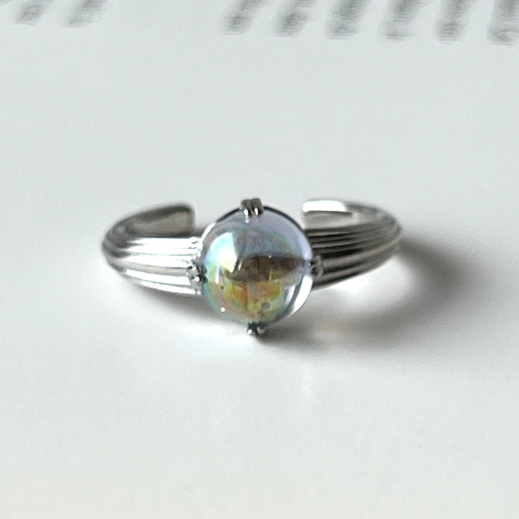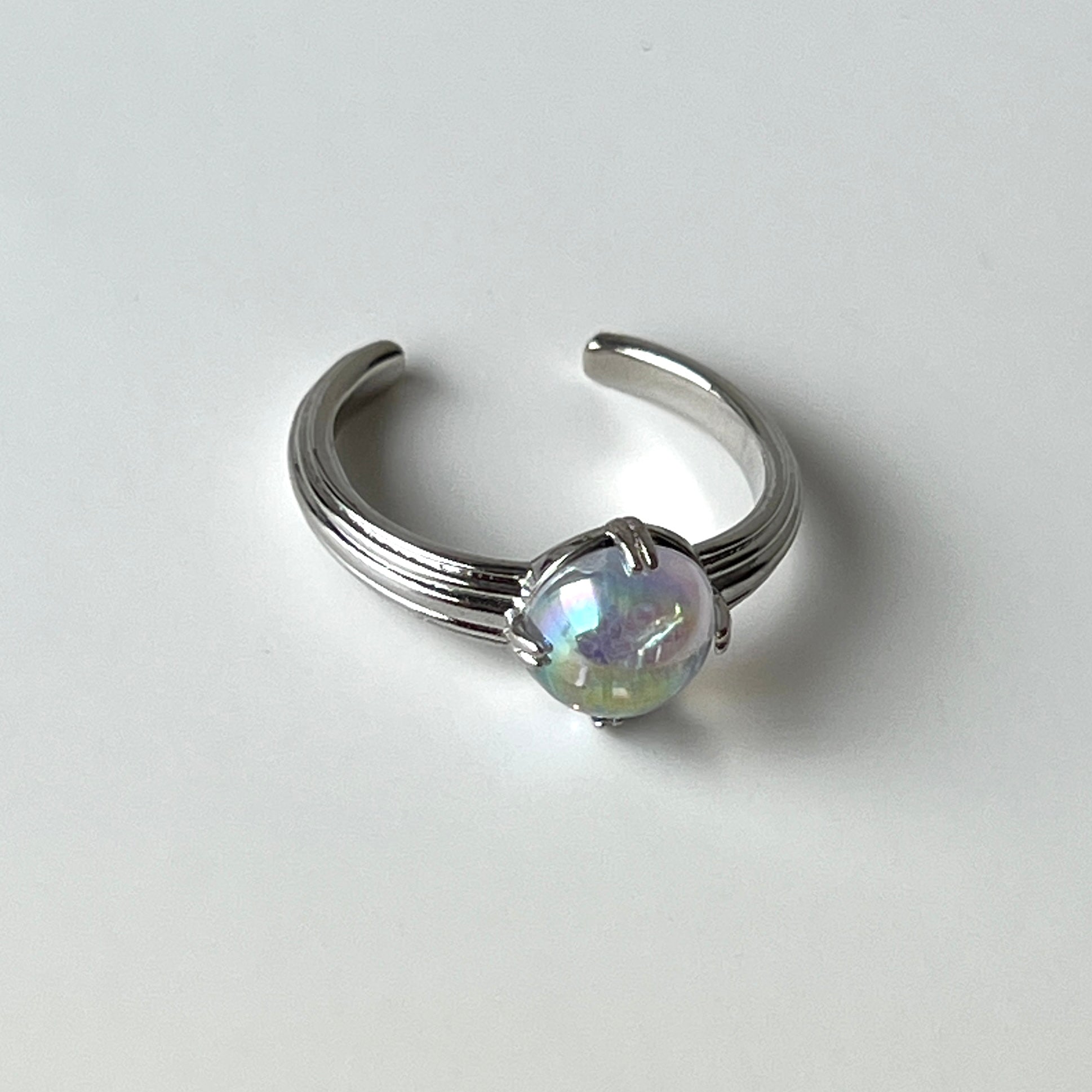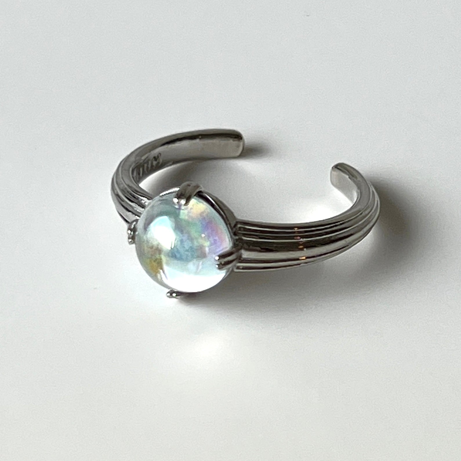一見シンプルなクリアな石にみえますが、泡立てた石鹸のしゃぼん玉のように複雑に輝きます