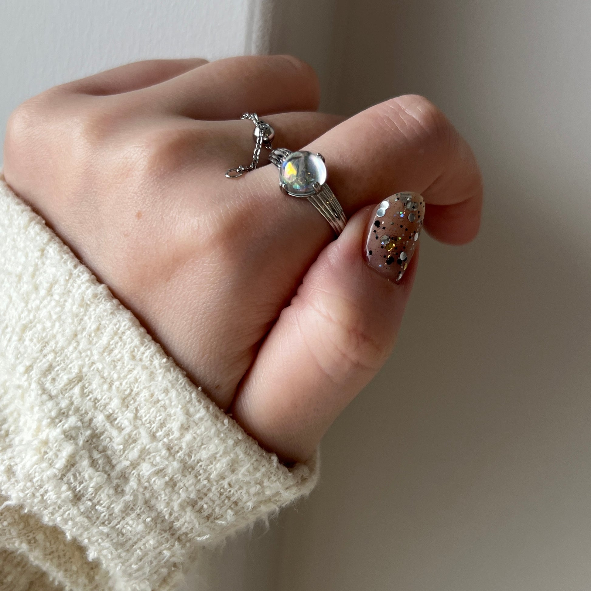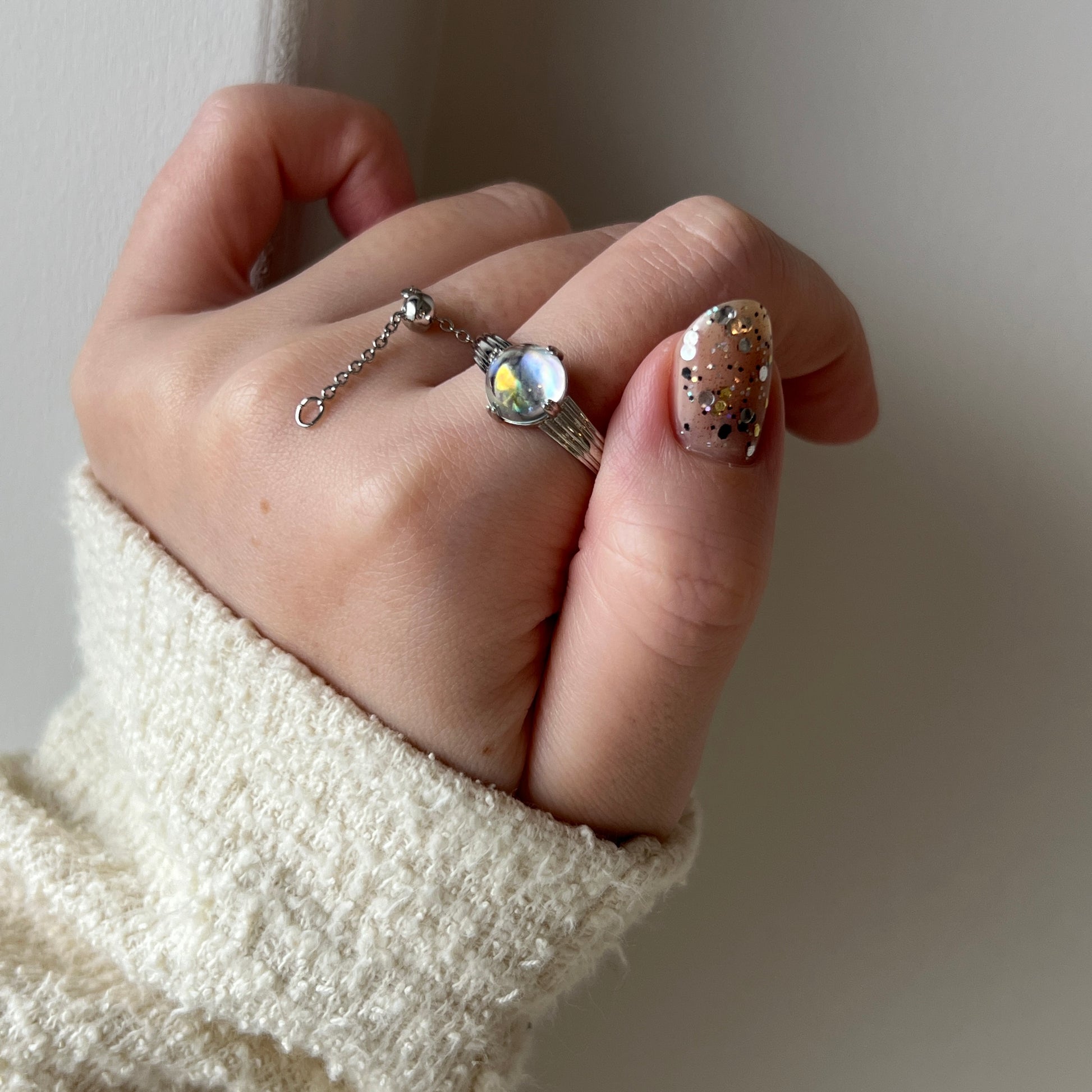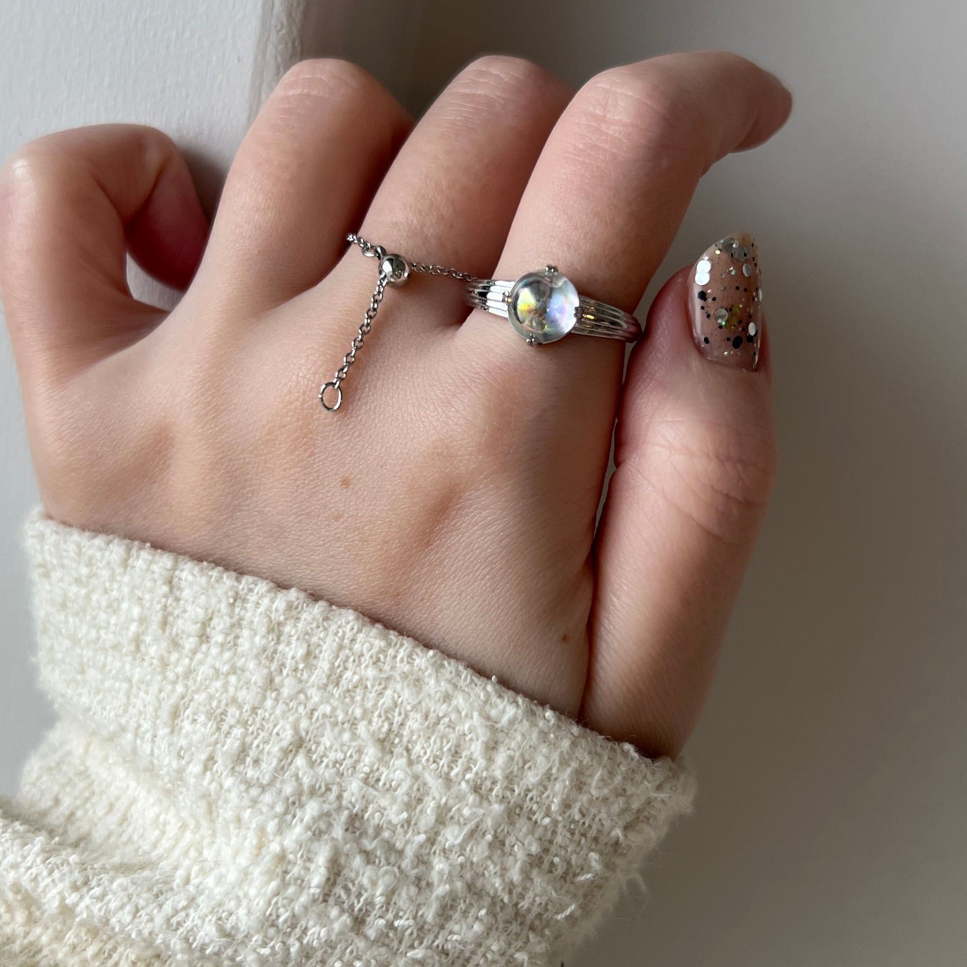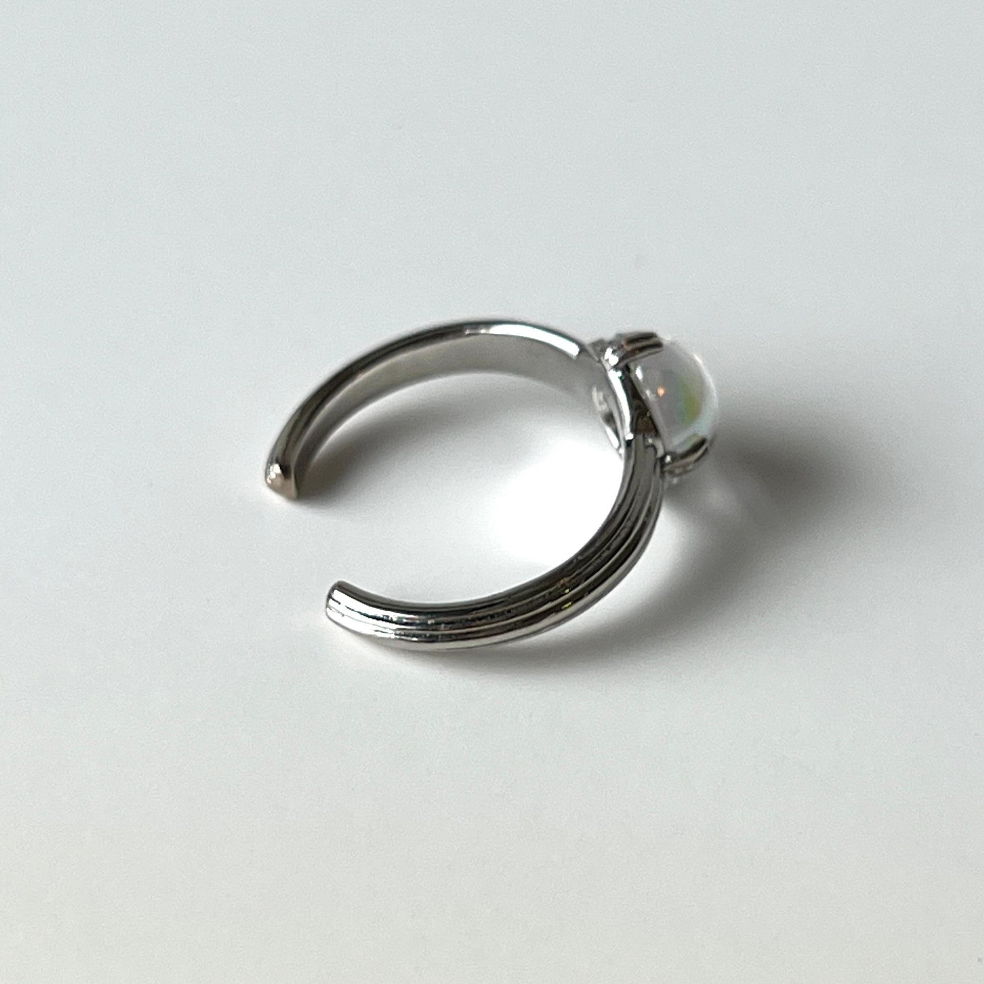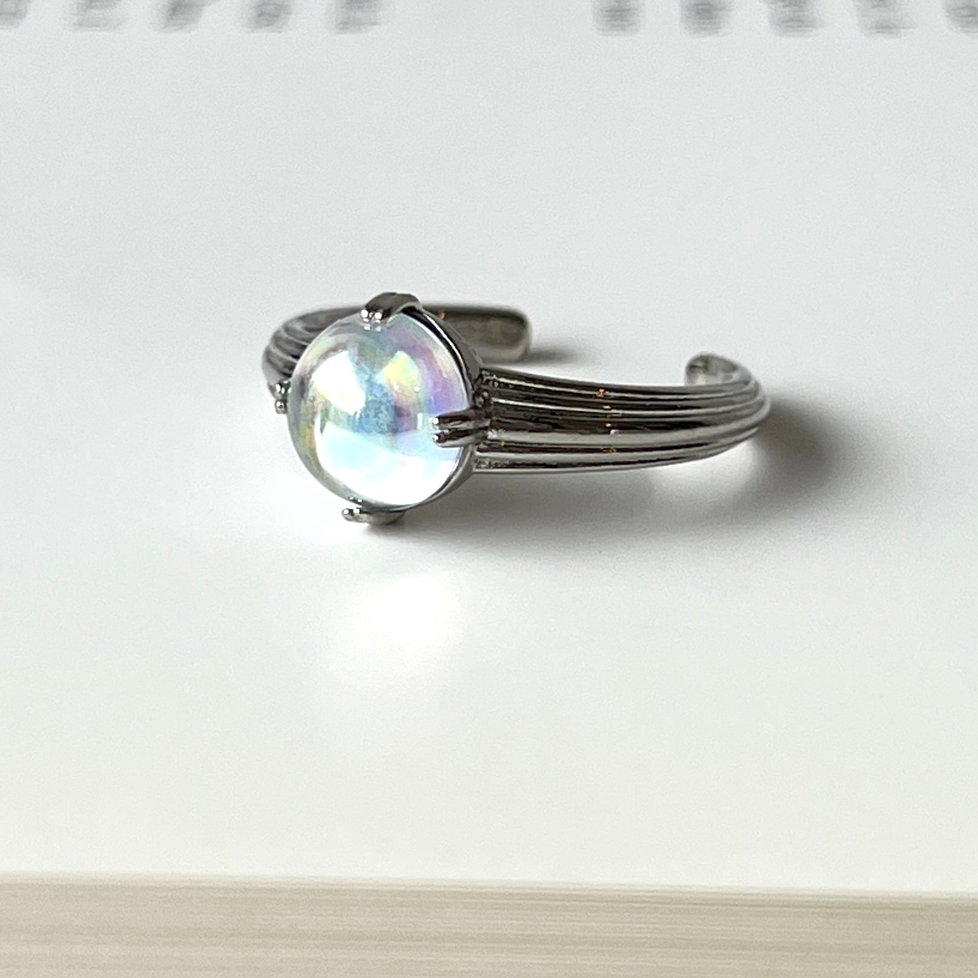 一見シンプルなクリアな石にみえますが、泡立てた石鹸のしゃぼん玉のように複雑に輝きます