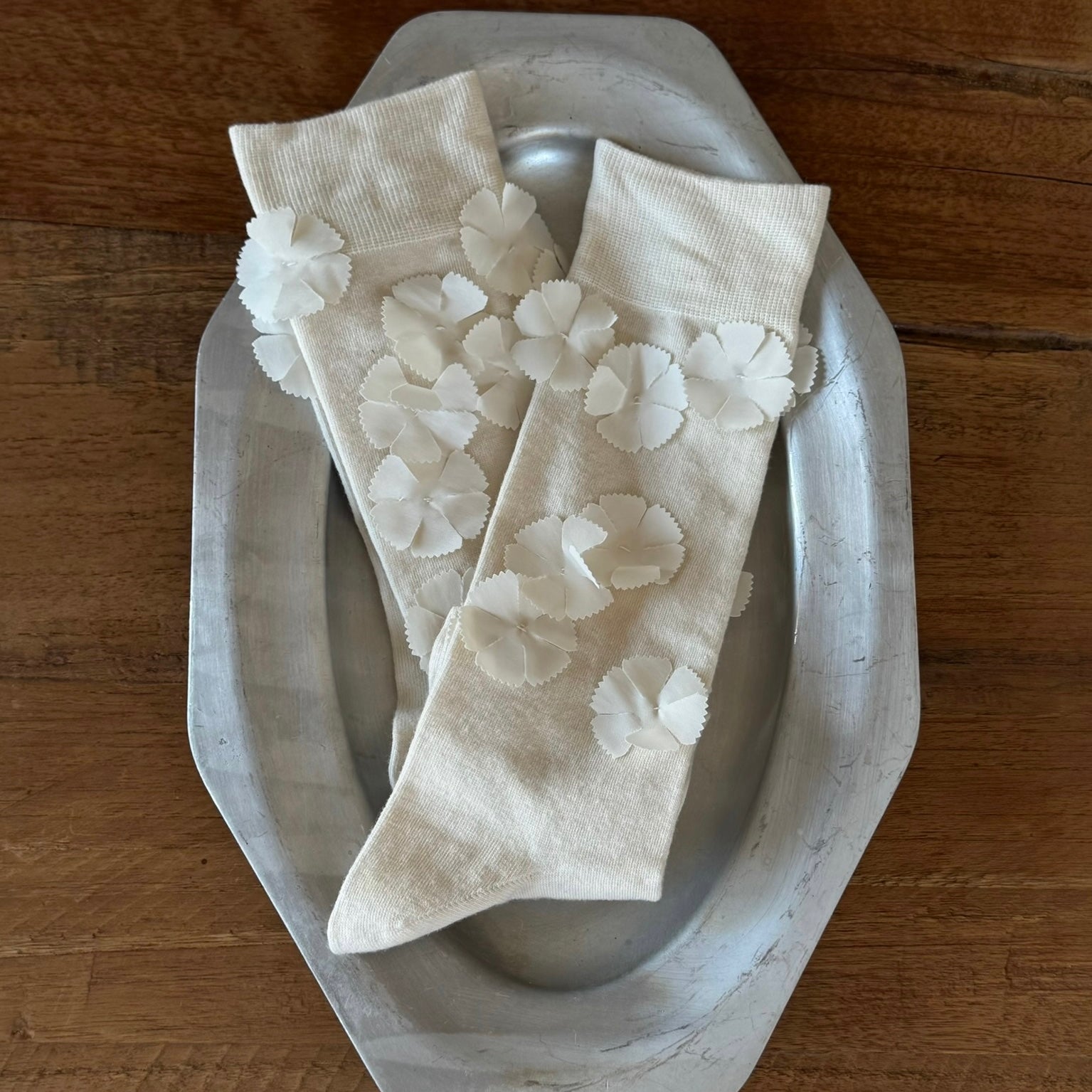 フラワーモチーフのパーツがたくさんついたデザインソックス。