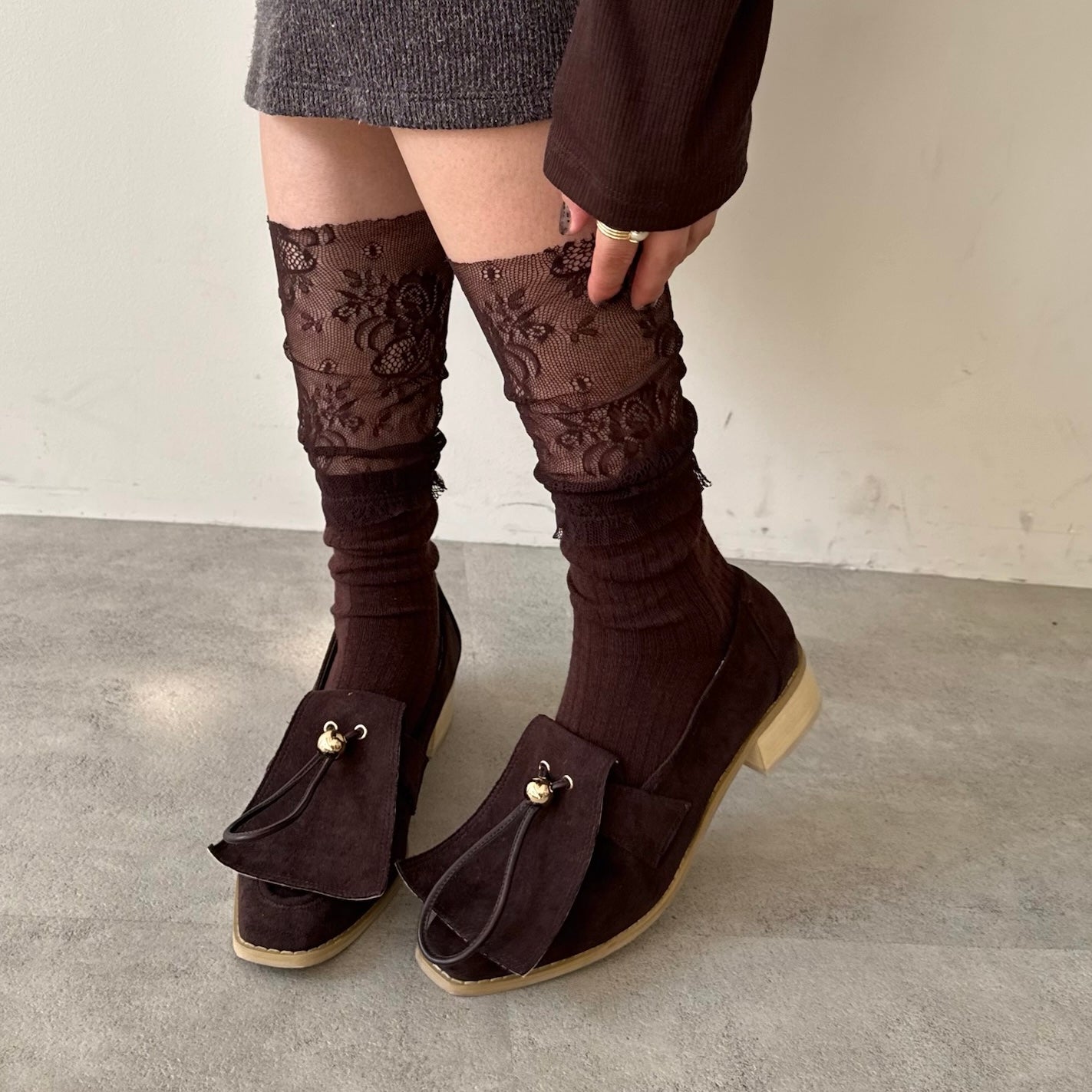 伸ばしてタイツのように履いたり、レース部分を縮めるように弛ませて履くのもおすすめです。