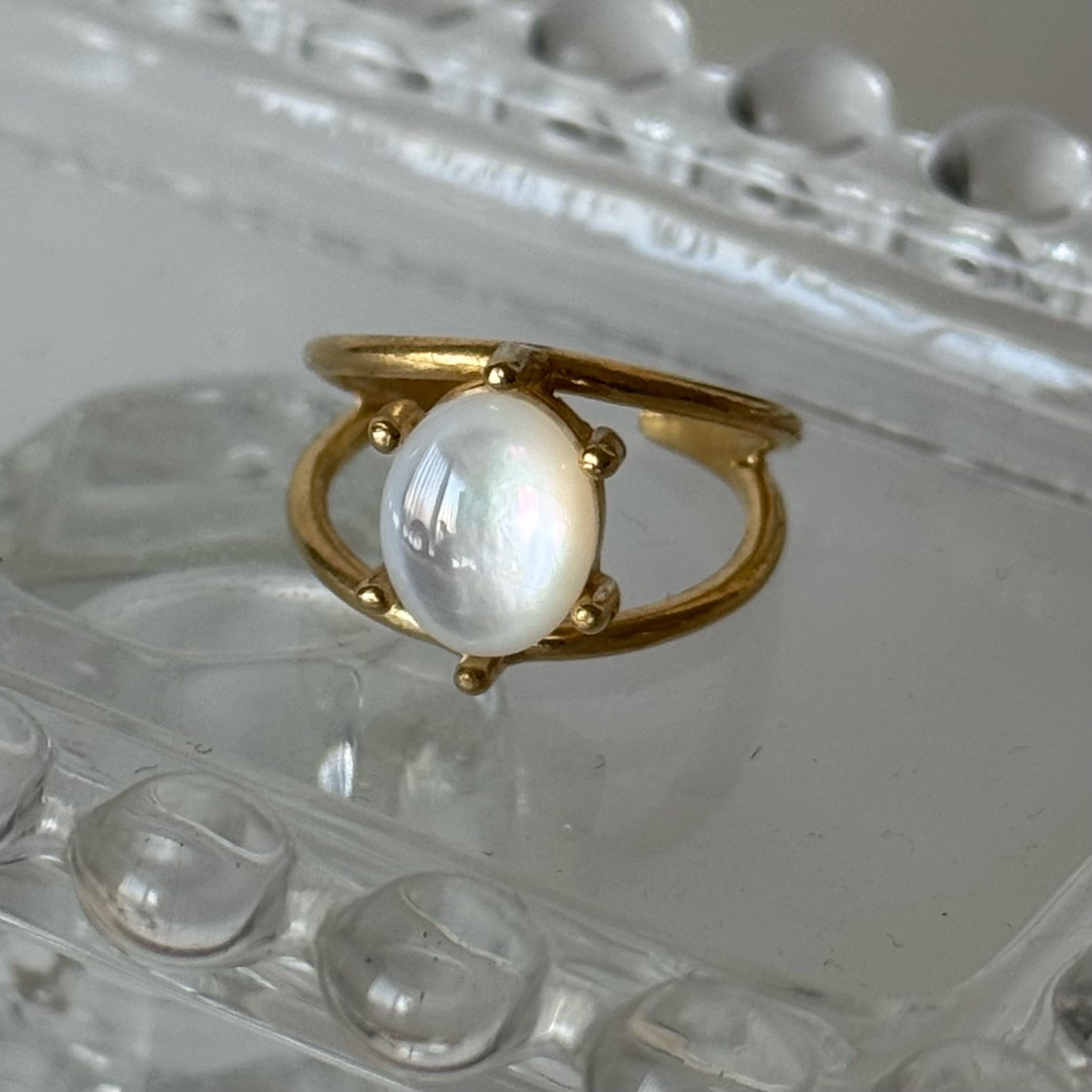 2本のリングでストーンを支えているような形のフリーサイズリング。 6つの爪で石を留めたどこかヴィンテージ感のあるデザインです。